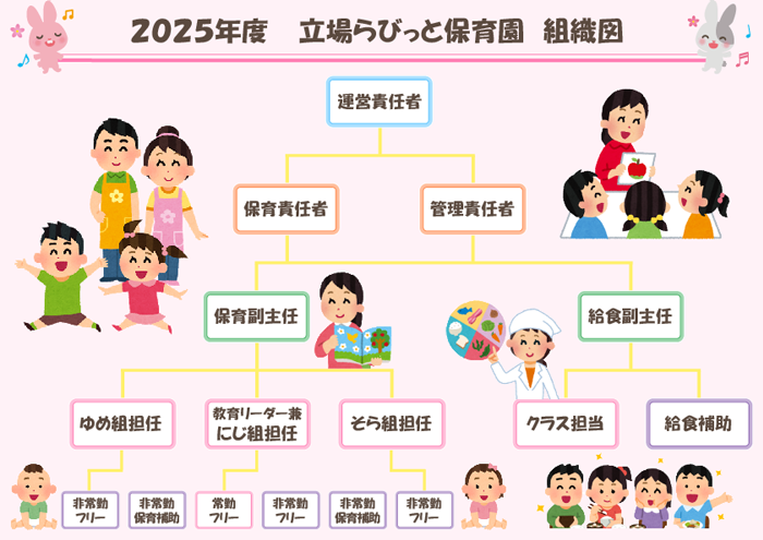| 職員構成 | 運営責任者 1名 ・ 管理責任者 1名 ・ 保育責任者 1名 ・ 保育士 10名 ・ 看護師 1名 ・ 栄養士 2名 ・ 調理師 1名 全17名 |